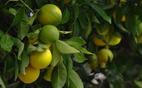 早晨,天空一碧如洗;中午,太阳火辣辣的照耀在果实上;晚上,树上的果实又象无数只小星星在闪闪发光,你说风景美不美。